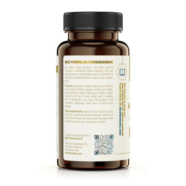 MCS FORMULES BIO ASHWAGANDHA, ook wel “Indiase ginseng” of Withania somnifera genoemd, wordt al eeuwenlang gebruikt in de traditionele Indiase geneeskunde. De hoofdbestanddelen zijn withanoliden zoals withaferin A, alkaloïden, steroïde lactonen, tropine en cuscohygrine (1).