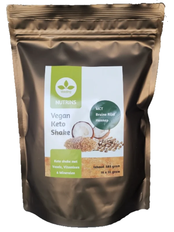Keto shake met MCT, proteïnen, vezels en vegan vitaminen en mineralen. Vegan ketose voeding rijk aan mct, vezels, proteïnen en VEGAN multivitaminen en mineralen 50% RI per portie. Past in een keto-dieet en high fat / low carb voeding, rijk aan MCT-vetzuren. 100% vegan, 11 gram MCT, 22% proteïnen, 4% koolhydraten, 34% vet, 34% vezels.